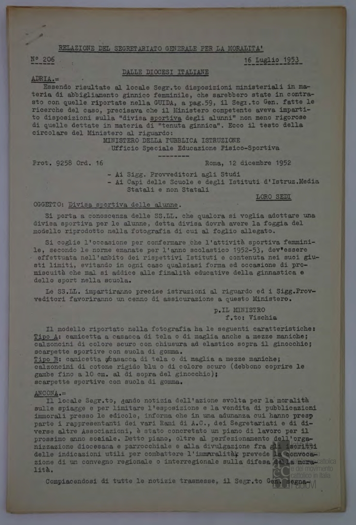 "Relazione del Segretariato Generale per la Moralità. Nr. 206"