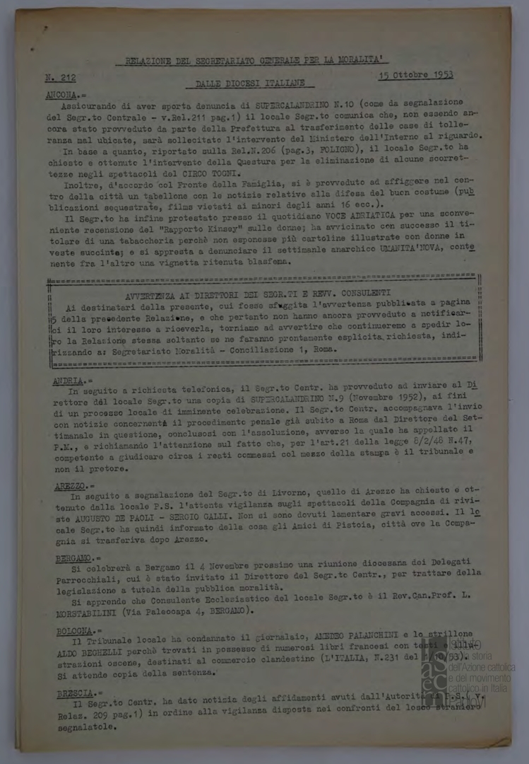 "Relazione del Segretariato Generale per la Moralità. Nr. 212"