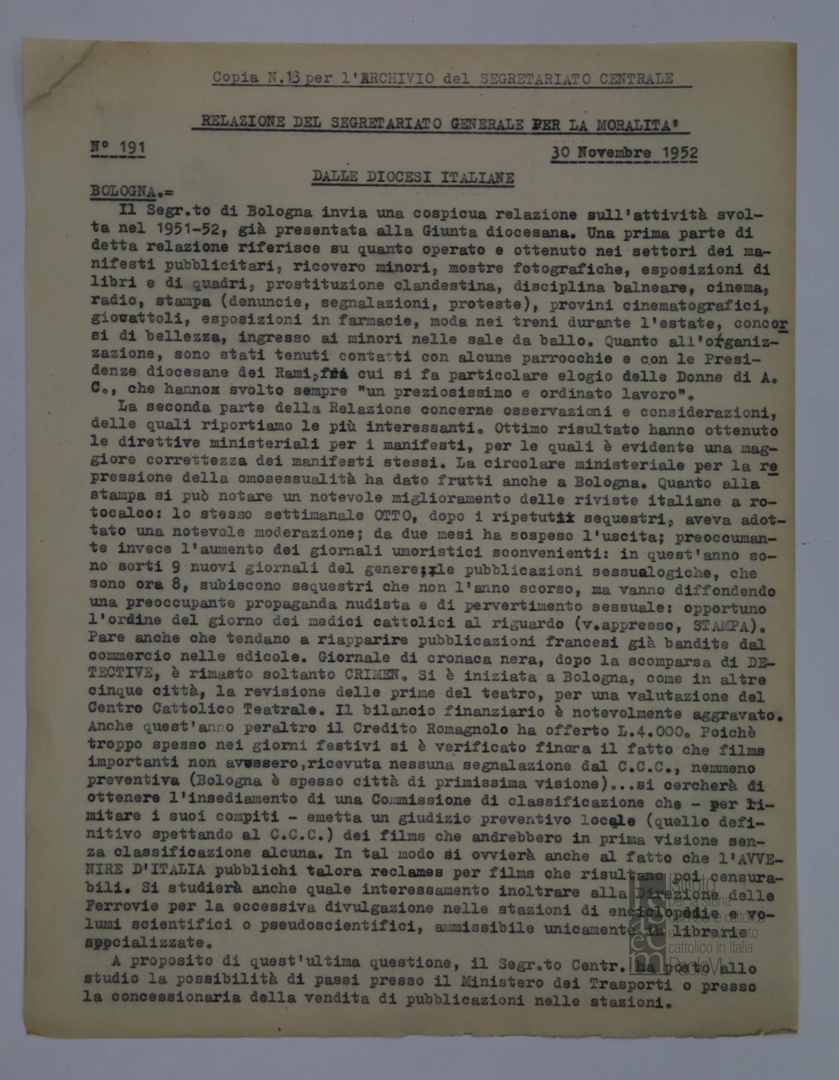 "Relazione del Segretariato Generale per la Moralità. Nr. 191"