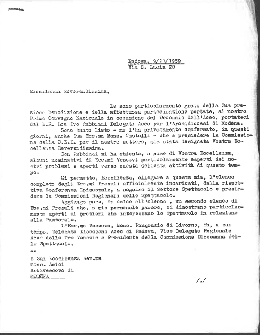 Lettera di mons. Francesco Dalla Zuanna, presidente dell'ACEC, a mons. Giuseppe Amici, arcivescovo di Modena