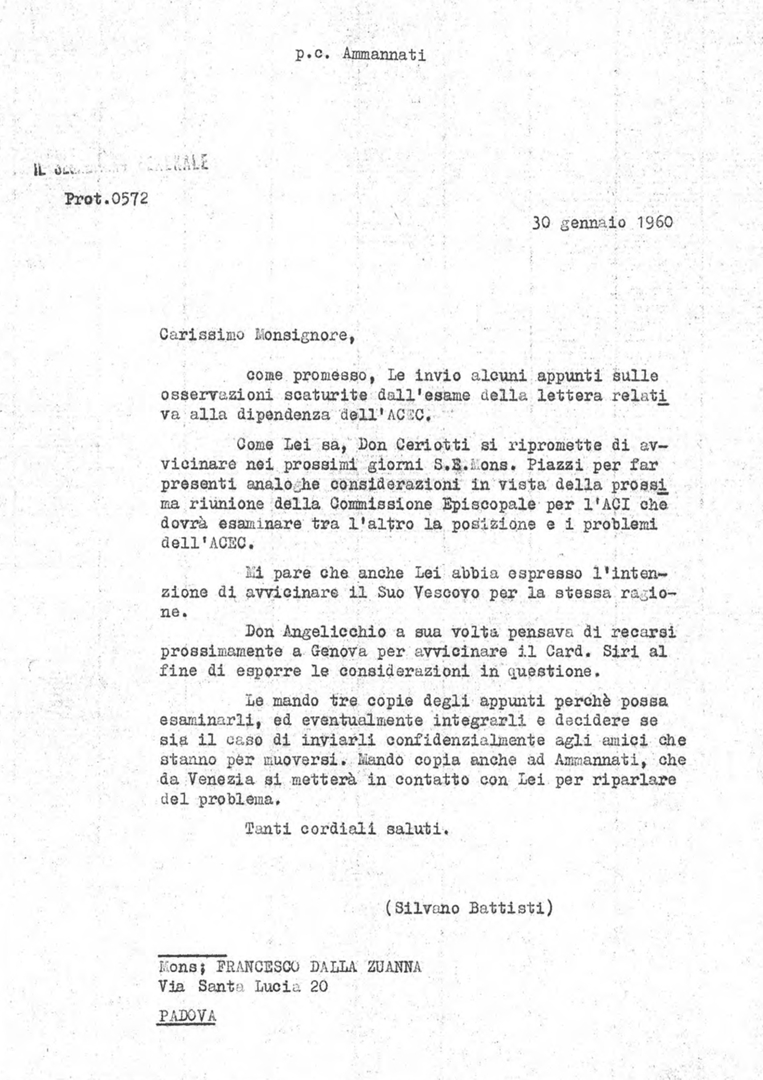 Lettera di Silvano Battisti, segretario generale, a mons. Francesco Della Zuanna