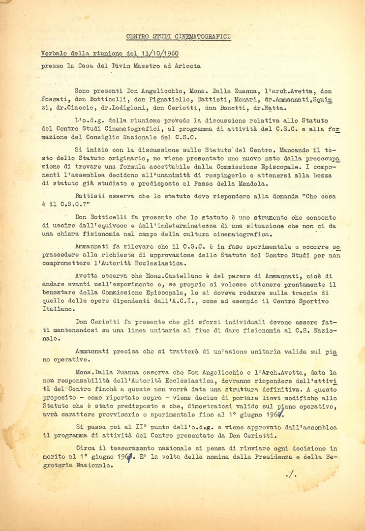 Centro studi cinematografici. Verbale della riunione tenutasi ad Ariccia in provincia di Roma il 13 ottobre 1960