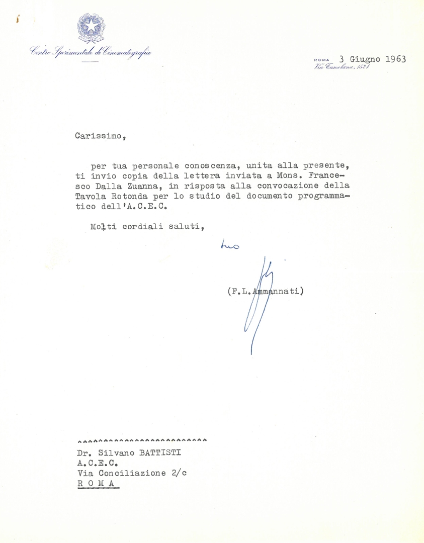Lettera di mons. Luigi Cardini, vice assistente ecclesiastico generale dell'ACI, a mons. Albino Galletto, consulente ecclesiastico dell'Ente dello spettacolo