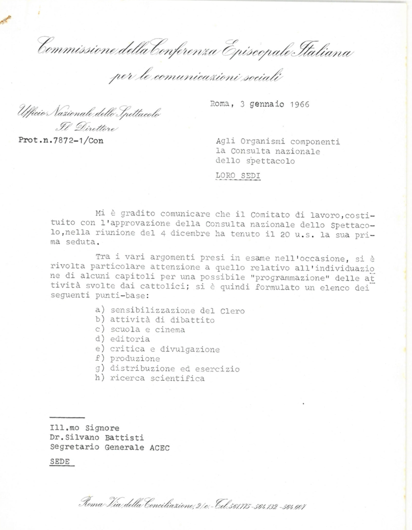 Lettera di don Francesco Angelicchio, direttore dell'Ufficio nazionale dello spettacolo, a Silvano Battisti, segretario generale dell'ACEC e agli organismi componenti la Consulta nazionale dello spettacolo