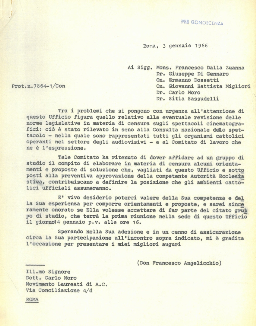 Lettera di don Francesco Angelicchio, direttore dell'Ufficio nazionale dello spettacolo, a Carlo Moro del Movimento laureati di A.C., e a Francesco Dalla Zuanna, Giuseppe Di Gennaro, Ermanno Dossetti, Giovanni Battista Migliori, Sitia Sassudelli