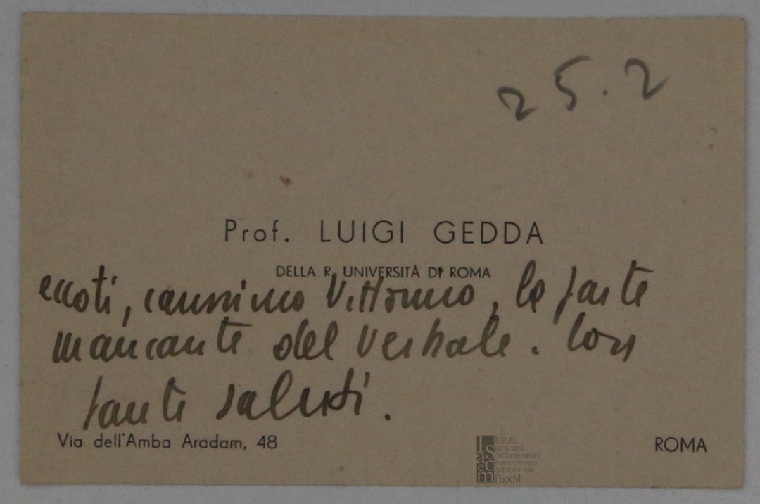 Bglietto di Luigi Gedda, presidente del Centro cattolico cinematografico - CCC, a Vittorino Veronese, presidente dell'ACI