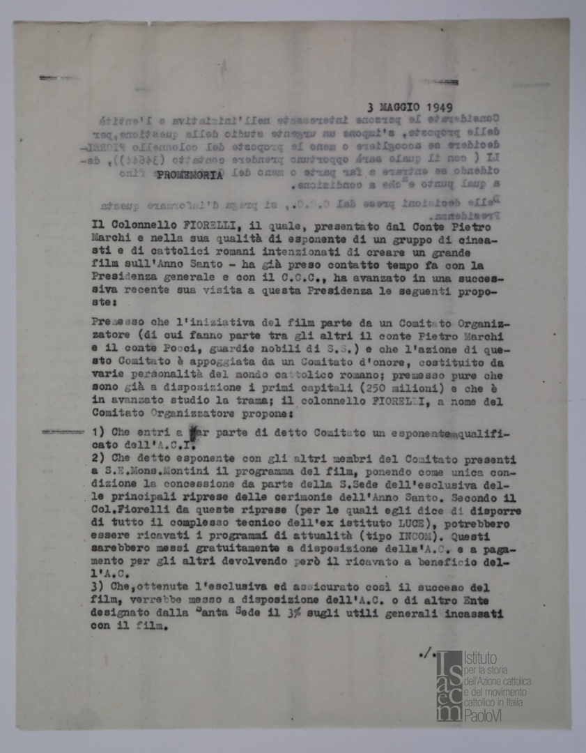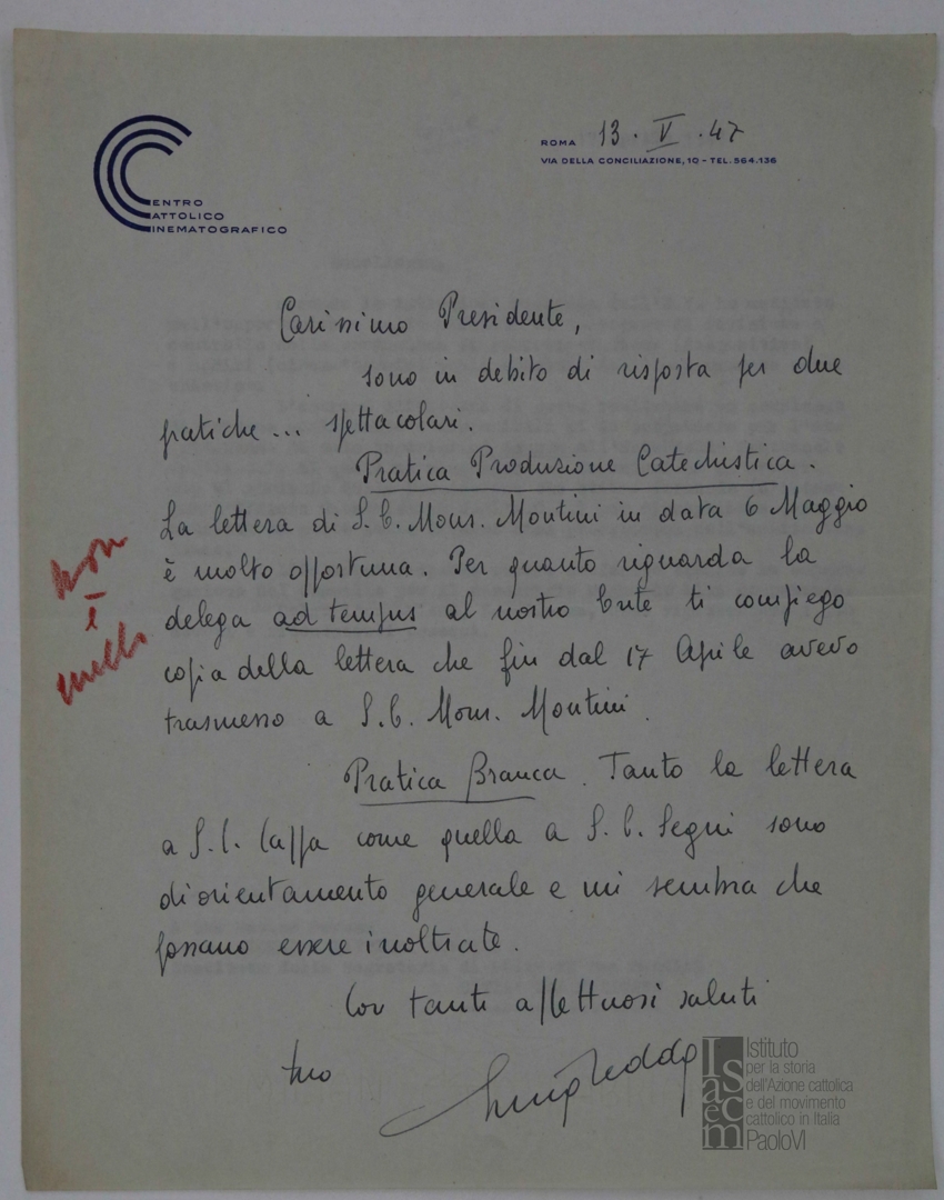 Lettera di mons. Ferdinando Prosperini, consulente ecclesiastico dell'Ente dello spettacolo, alla Direzione generale dell'ACI e per conoscenza a mons. Giovanni Battista Montini, sostituto alla segreteria di Stato di Sua Santità