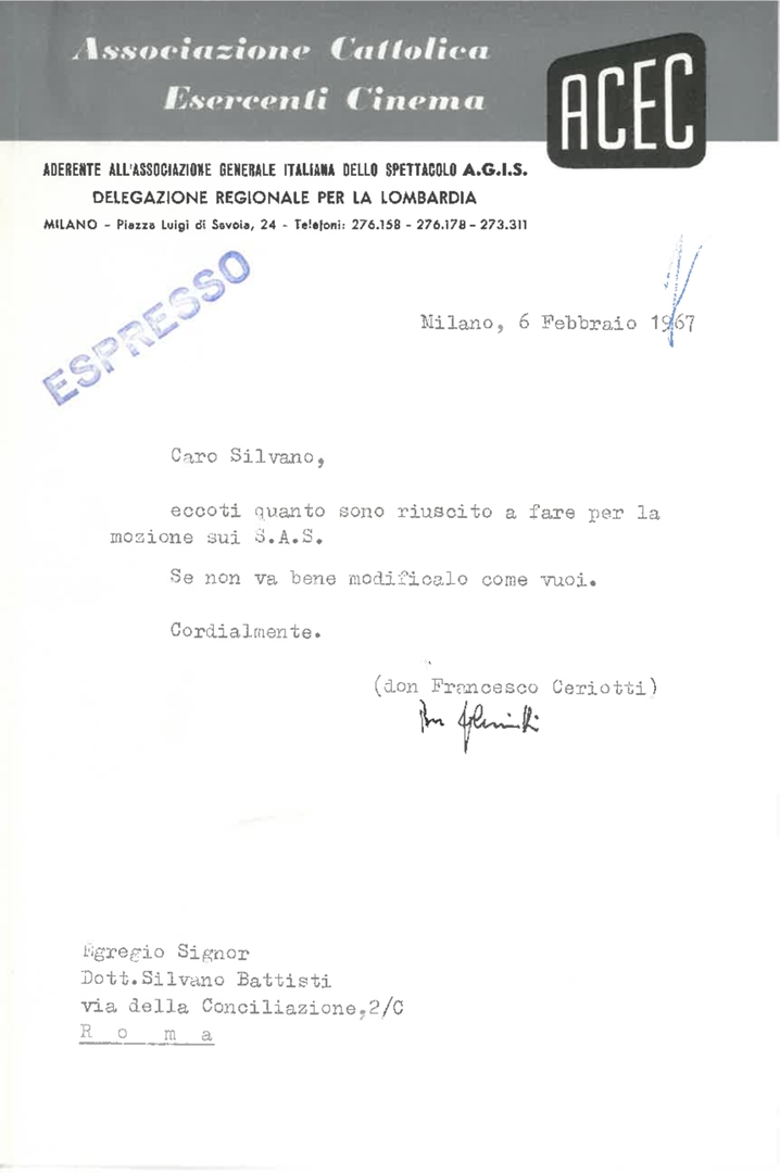 Lettera di don Francesco Ceriotti, delegato regionale per la Lombardia, a Silvano Battisti, segretario generale dell'ACEC