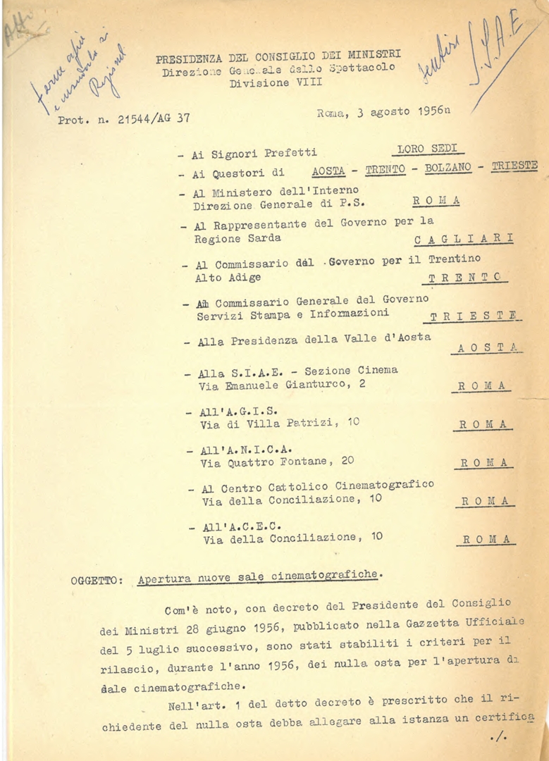 Lettera della Direzione generale dello spettacolo alle Prefetture della Repubblica e ad altri destinatari