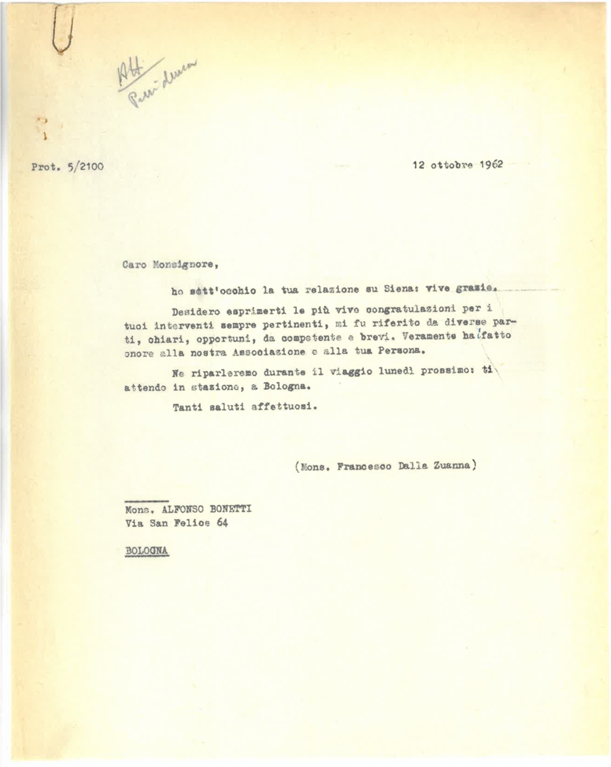 Lettera di mons. Francesco Dalla Zuanna, presidente dell'ACEC, a mons. Alfonso Bonetti, parroco della parrocchia di Santa Maria della Carità di Bologna