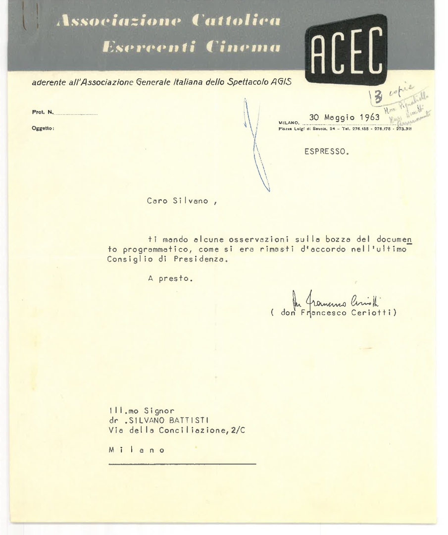 Lettera di Silvano Battisti, segretario generale dell'ACEC, a don Alfonso Bonetti, parroco della parrocchia di Santa Maria della Carità di Bologna