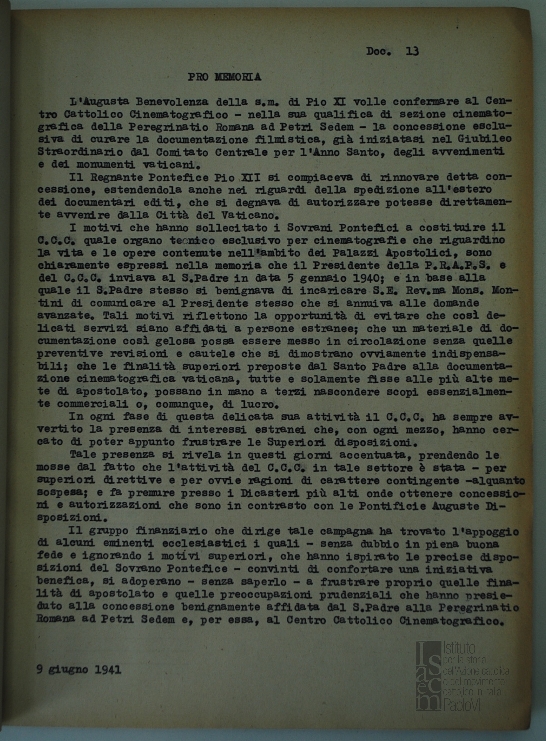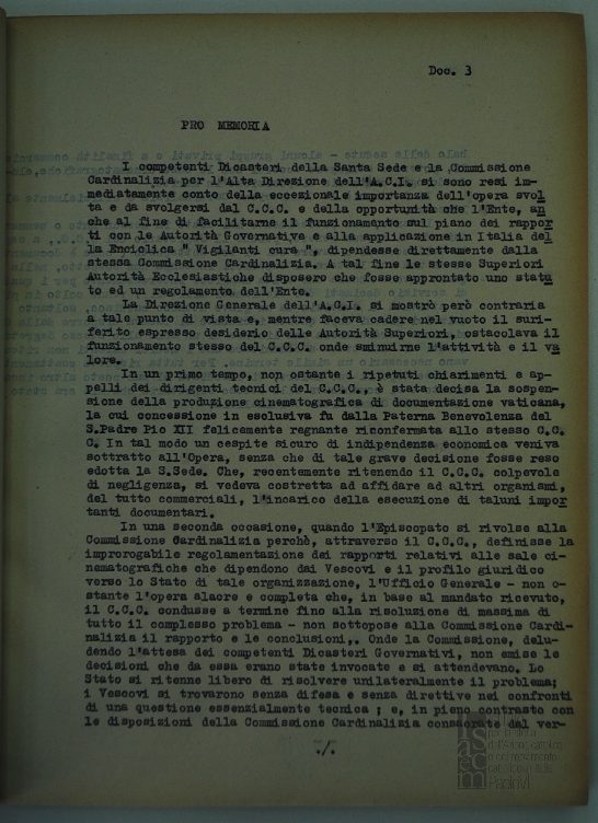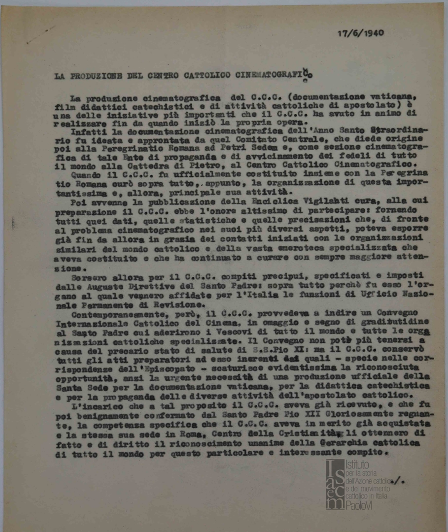"Pro memoria: Attività del Centro Cattolico Cinematografico"