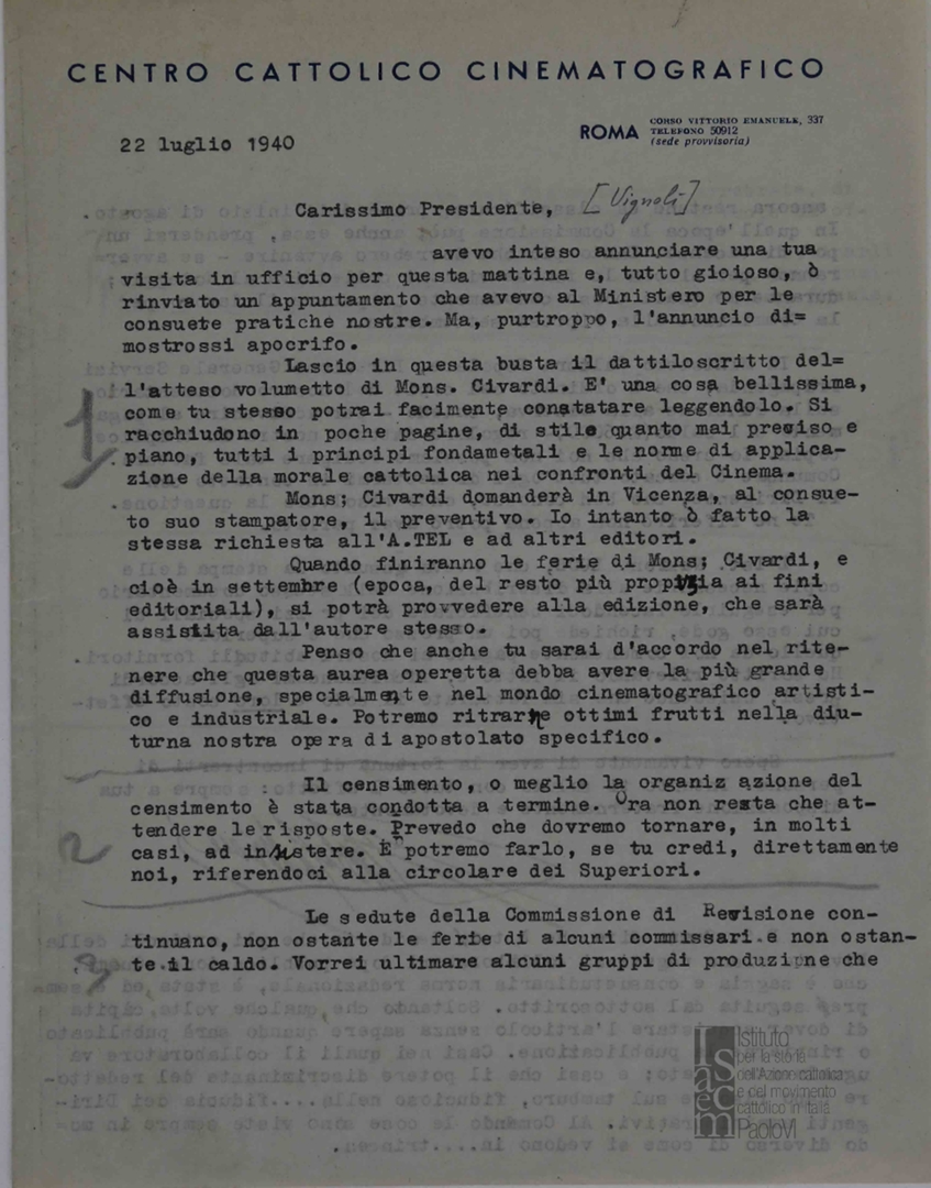 Lettera di Paolo Salviucci, segretario del Centro cattolico cinematografico - CCC, a Lamberto Vignoli, presidente del Centro