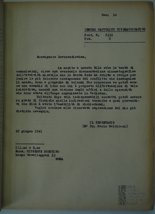 Lettera di Paolo Salviucci, segretario del Centro cattolico cinematografico - CCC, a mons. Giuseppe Borghino, vice direttore generale dell'ACI