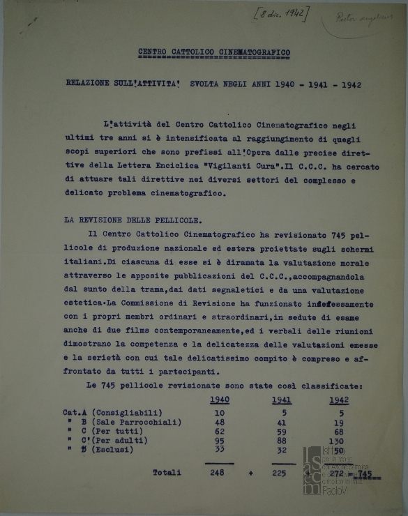 "Centro Cattolico Cinematografico. Relazione sull'attività svolta negli anni 1940 - 1941 - 1942", a cura di di Diego Fabbri, segretario del CCC
