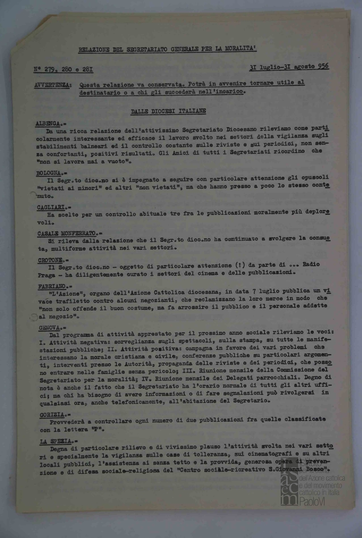 "Relazione del Segretariato Generale per la Moralità. Nn. 279-280-281"