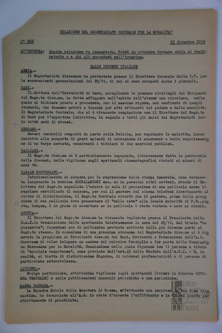 "Relazione del Segretariato Generale per la Moralità. Nr. 288"