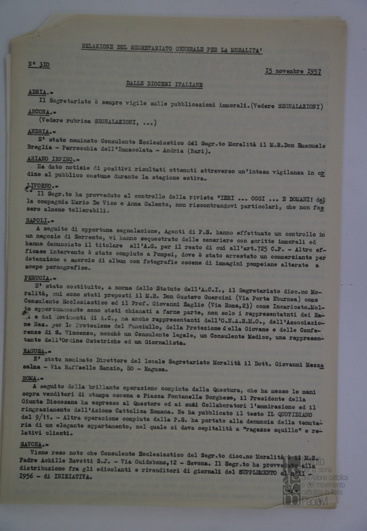"Relazione del Segretariato Generale per la Moralità. Nr. 310"