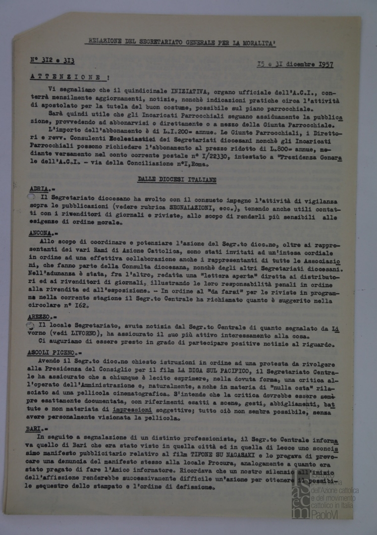 "Relazione del Segretariato Generale per la Moralità. Nn. 312-313"