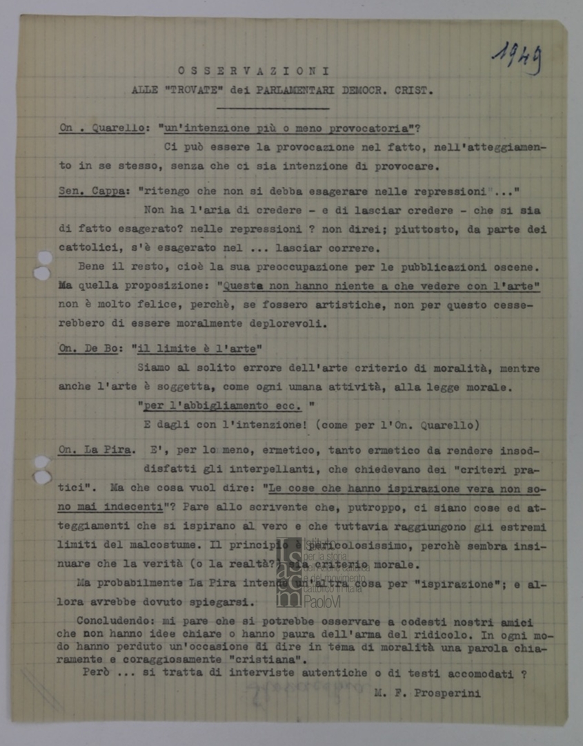 "Osservazioni alle 'trovate' dei parlamentari Democrazia Cristiana", a cura di mons. Ferdinando Prosperini