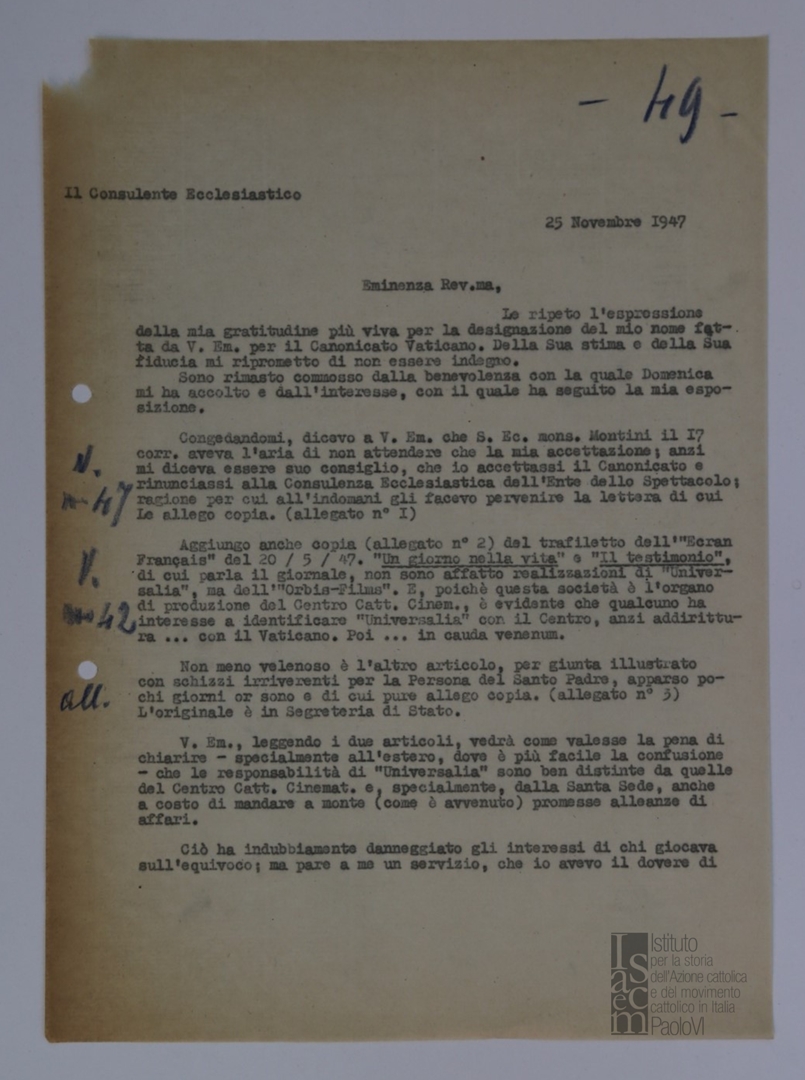 Lettera di mons. Giovanni Battista Montini, sostituto alla segreteria di Stato di Sua Santità, a mons. Ferdinando Prosperini, assistente ecclesiastico centrale del Centro cattolico cinematografico - CCC