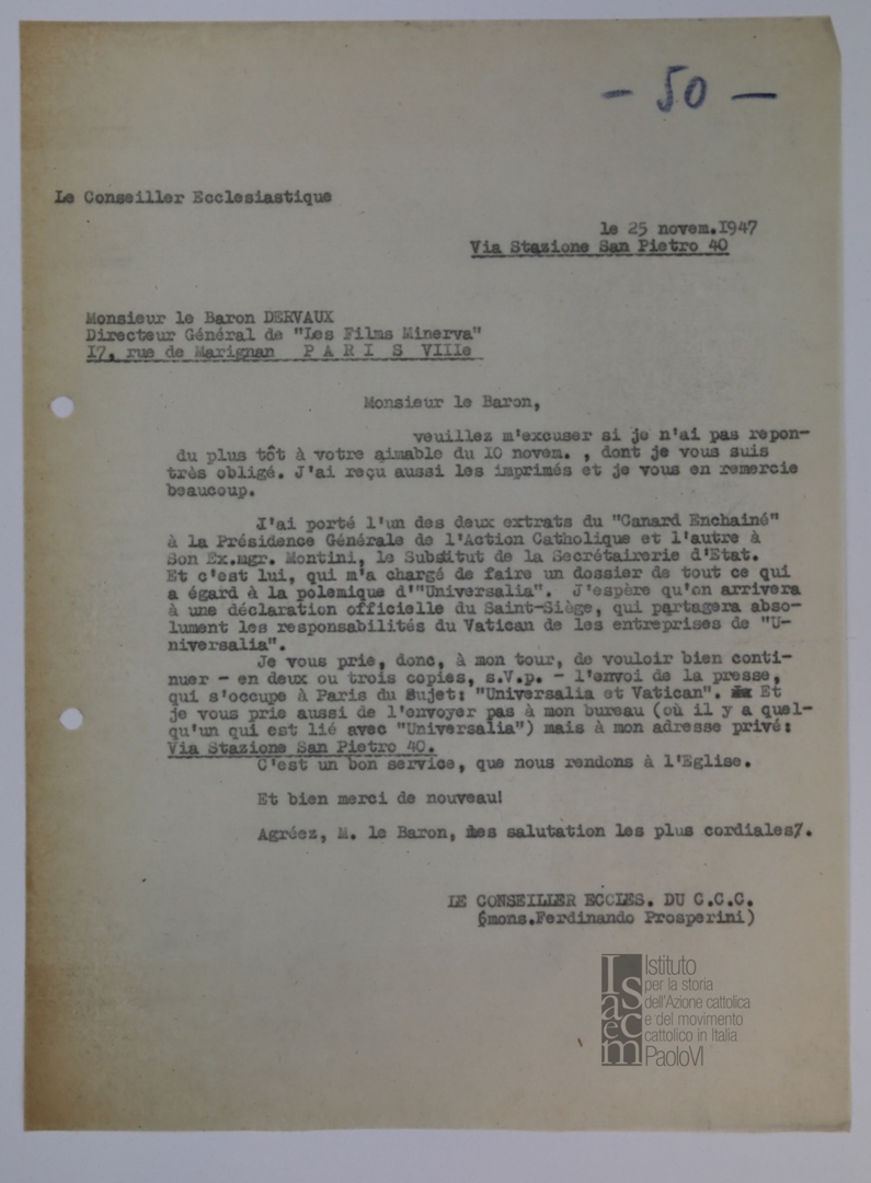 Lettera di mons. Ferdinando Prosperini, consulente ecclesiastico dell'Ente dello spettacolo, a Raymond Dervaux, direttore generale della Minerva Film