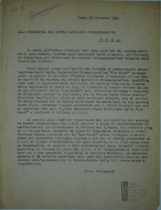 "Relazione dell'attività del Centro Cattolico Cinematografico nei mesi di ottobre-novembre 1947" e "Relazione mensile del C.C.T."