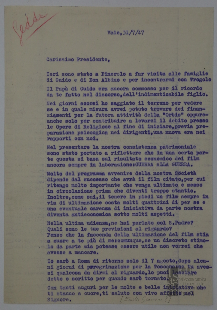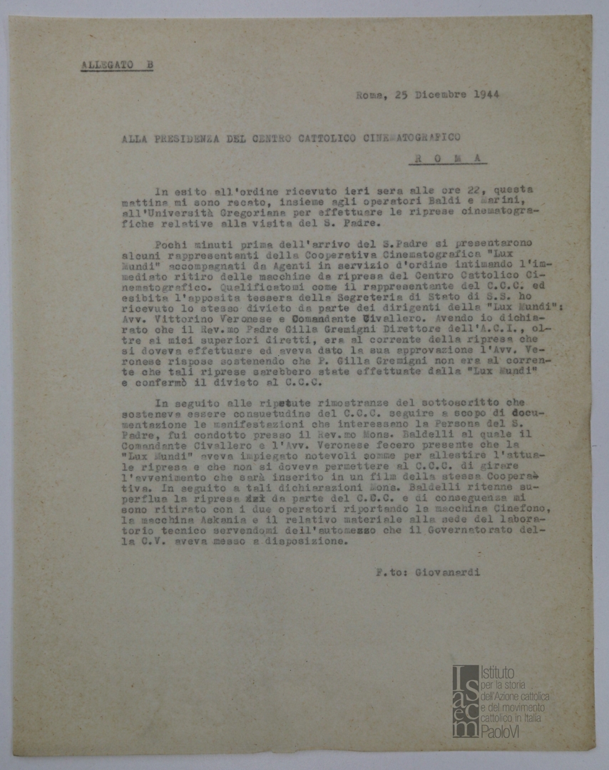 Lettera di Vittorino Veronese, segretario generale dell'ACI, a mons. Giovanni Battista Montini, sostituto alla segreteria di Stato di Sua Santità
