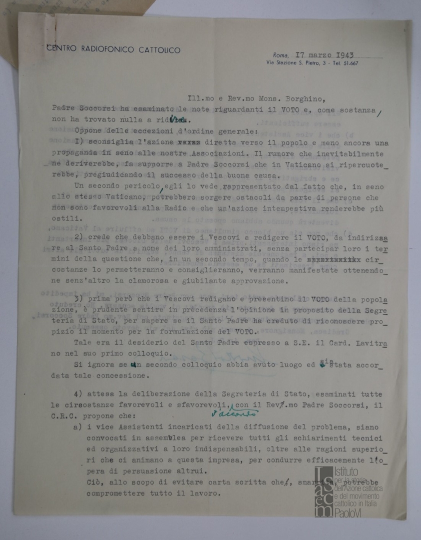 "Pro memoria circa una eventuale dotazione della Radio Vaticana di una stazione ad onde medie, atta ad essere bene ricevuta in Italia"
