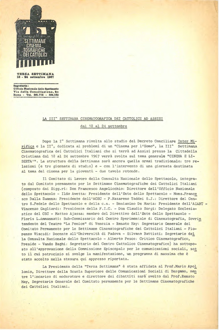 III Settimana cinematografica dei cattolici ad Assisi, dal 18 al 24 settembre 1967, dedicata al tema "Cinema e Libertà". Programma della manifestazione