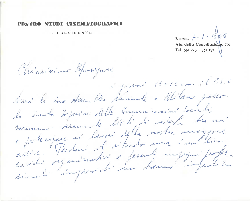 Lettera di Franco Bollati, presidente del Centro studi cinematografici - CSC, a mons. Francesco Dalla Zuanna, presidente dell'ACEC