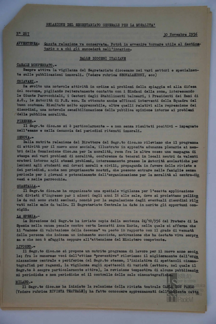 "Relazione del Segretariato Generale per la Moralità. Nr. 287"