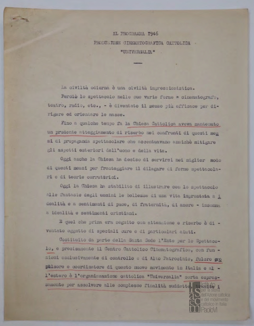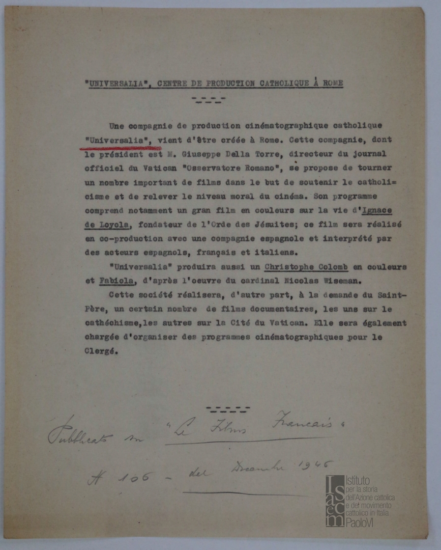 "Il programma 1946. Produzione cinematografica cattolica 'Universalia'"