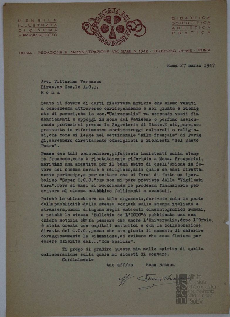 Lettera di Remo Branca, segretario generale della Confédération international du film - CIF, su carta intestata della "Rivista del passo ridotto", a Vittorino Veronese, presidente dell'ACI