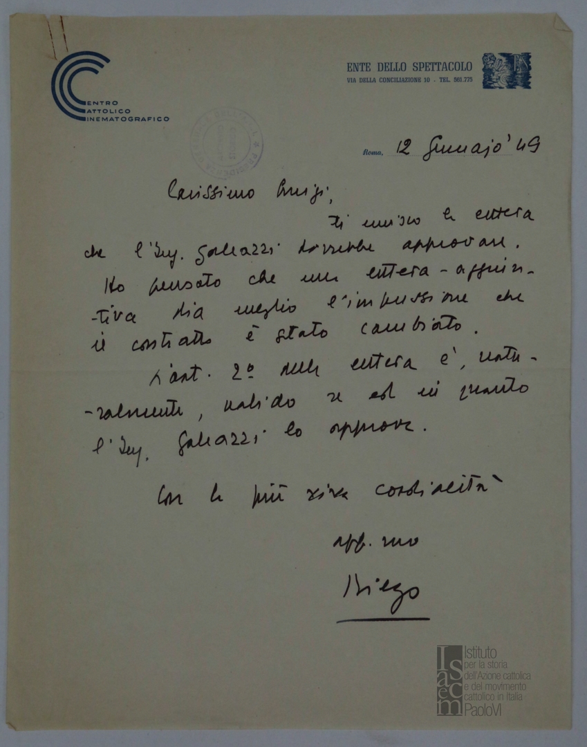Lettera di Diego Fabbri, segretario del Centro cattolico cinematografico - CCC, a Luigi Gedda