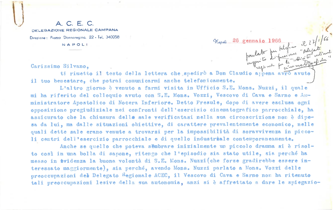 Lettera di mons. Luigi Pignatiello a Silvano Battisti, segretario generale dell'ACEC