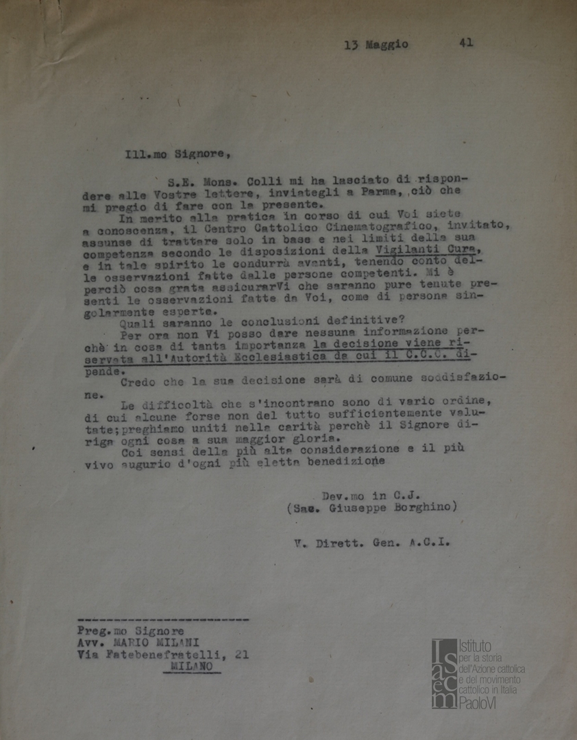 Lettera di mons. Giuseppe Borghino, vice direttore generale dell'ACI, a Mario Milani, direttore del Consorzio per il cinema educativo
