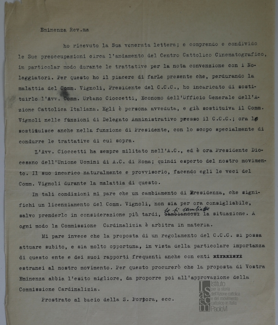 Lettera di Paolo Salviucci, segretario del Centro cattolico cinematografico - CCC, a mons. Evasio Colli, segretario della Commissione cardinalizia per l'ACI