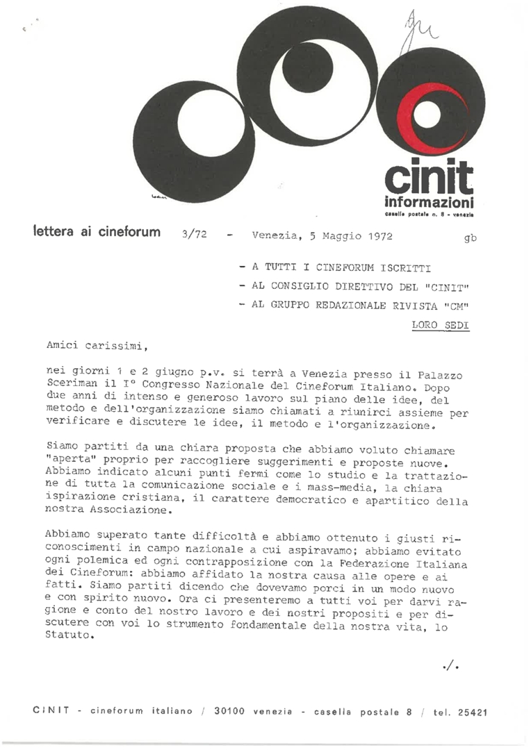 CINIT - Informazioni. Lettera ai cineforum 3/72 . "CINIT - CINEFORUM ITALIANO, I° congresso nazionale del cineforum italiano, Venezia, Palazzo Sceriman, 1-2 giugno 1972". Programma