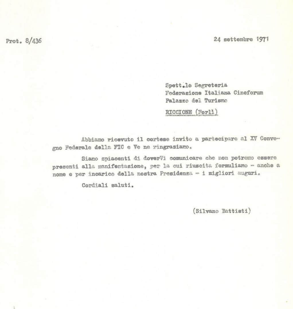 Lettera di Silvano Battisti, segretario generale dell'ACEC, alla segreteria della Federazione Italiana Cineforum - FIC