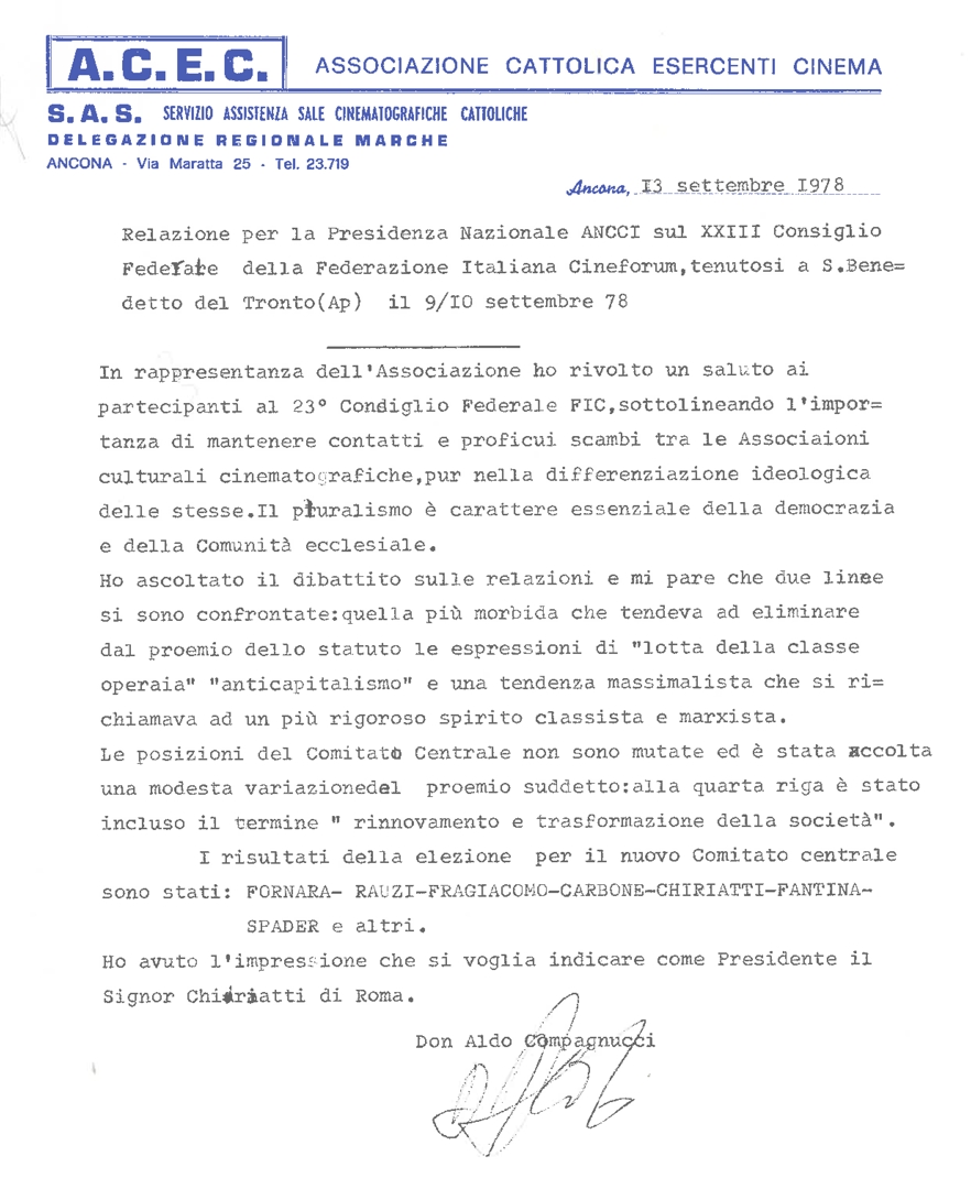 "Relazione per la presidenza nazionale ANCCI sul XXIII consiglio federale della Federazione Italiana Cineforum tenutosi a San Benedetto del Tronto (AP) il 9-10 settembre 78"