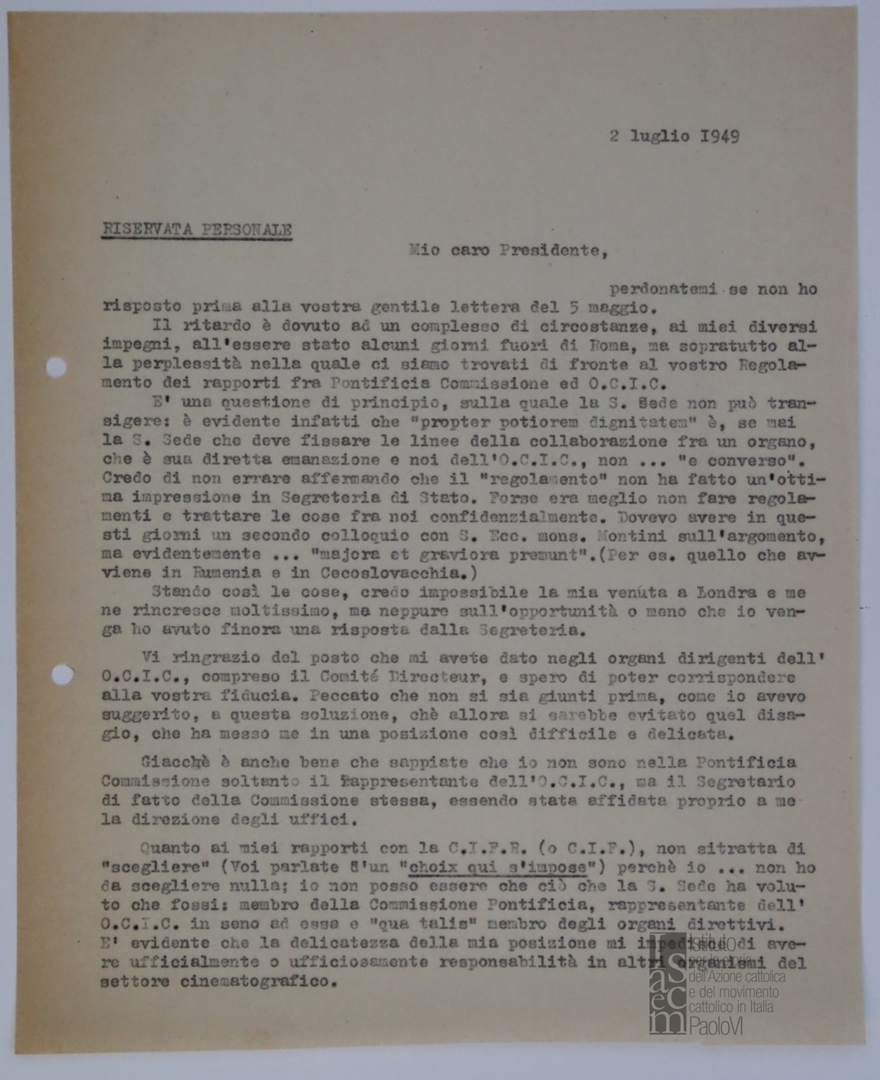Lettera non firmata indirizzata a mons. Martin John O'Connor, presidente della Pontificia commissione per la cinematografia didattica e religiosa, e a mons. Giovanni Battista Montini, sostituto alla segreteria di Stato di Sua Santità