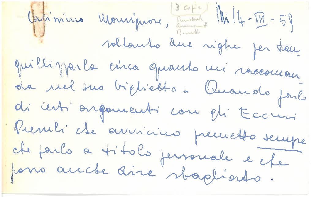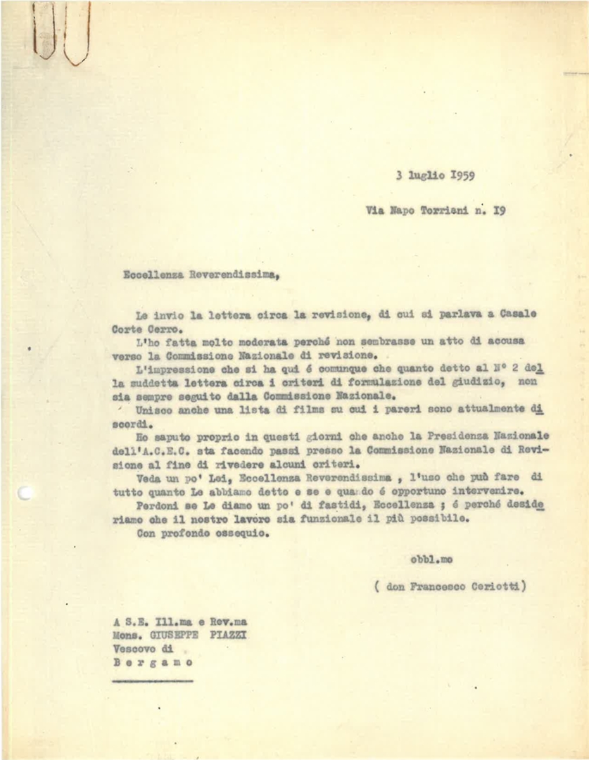 Lettera di don Francesco Angelicchio, presidente della commissione nazionale di revisione, e di don Giuseppe Sisti, a mons. Giuseppe Piazzi, vescovo di Bergamo