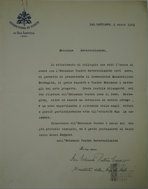 Lettera di Edoardo Prettner Cippico, della Segreteria di Stato della Santa Sede, a destinatario non indicato