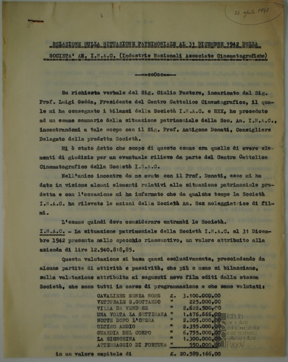 "Relazione sulla situazione patrimoniale al 31 dicembre 1942 della Società An. I.N.A.C. (Industrie Nazionali Associate Cinematografiche)", a cura di Girolamo Scriattoli
