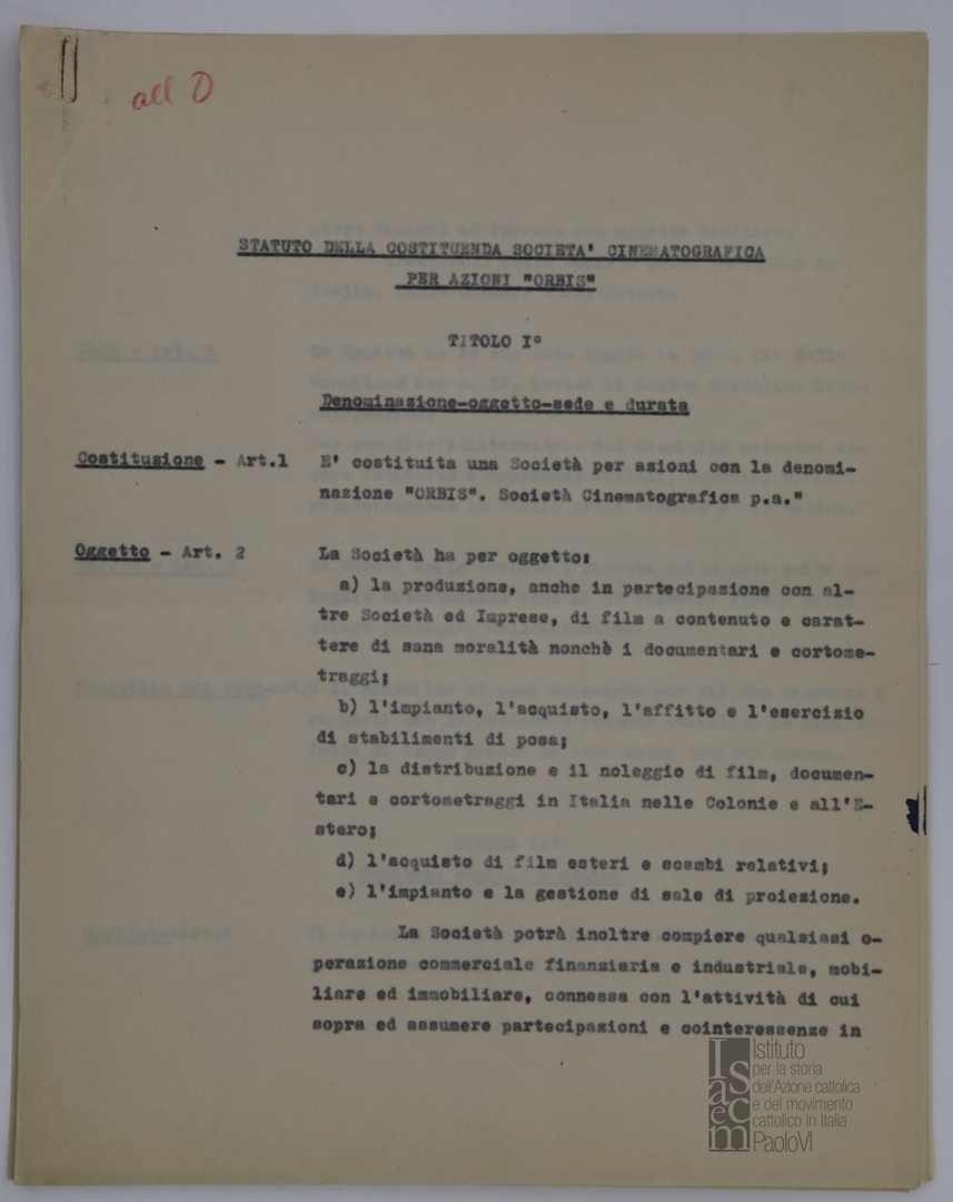 "Statuto della costituenda società cinematografica per azioni ORBIS"