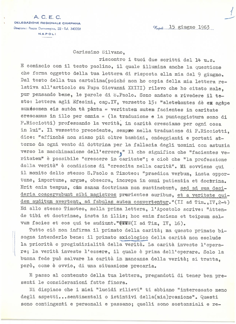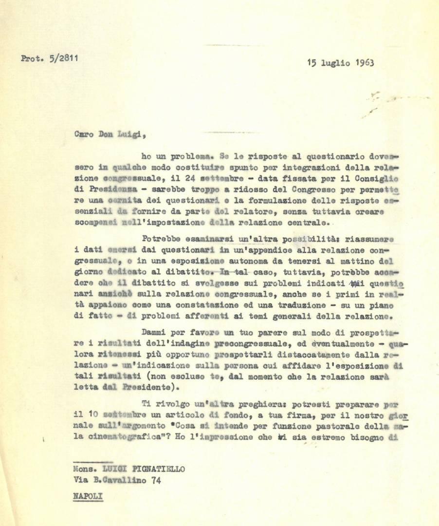 Lettera di Luigi Pignatiello, delegato diocesano e regionale dell'ACEC per la Campania, a Silvano Battisti, segretario generale dell'ACEC