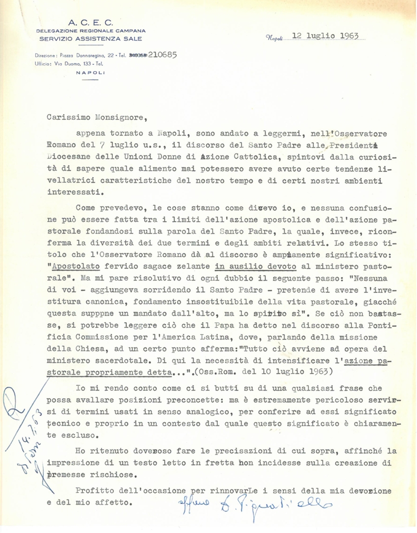 Lettera di Silvano Battisti, segretario generale dell'ACEC, a Luigi Pignatiello, delegato diocesano e regionale dell'ACEC per la Campania
