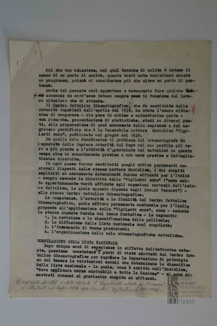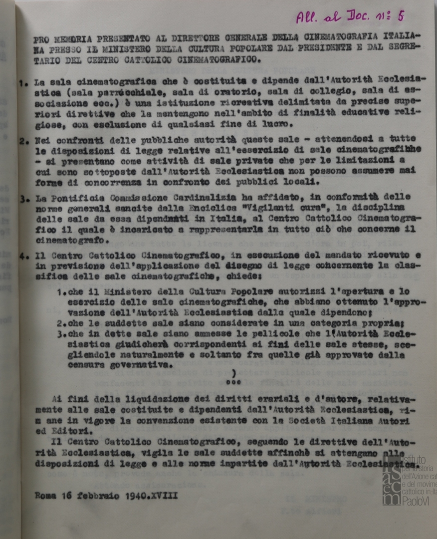 "Pro memoria presentato al direttore generale della cinematografia italiana presso il Ministero della cultura popolare dal presidente e dal segretario del Centro cattolico cinematografico"