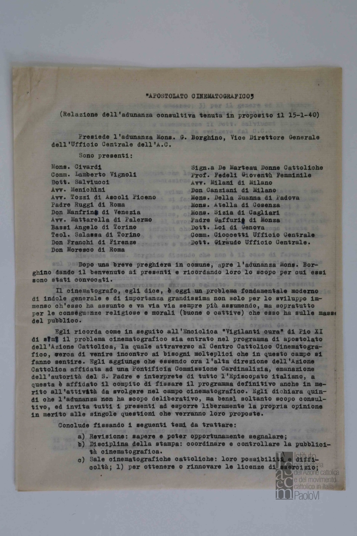 "Apostolato cinematografico. Relazione dell'adunanza consultiva tenuta in proposito il 15-1-40"
